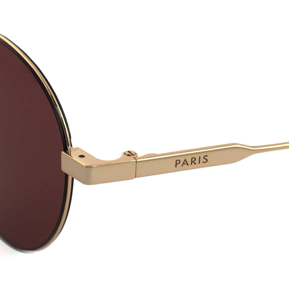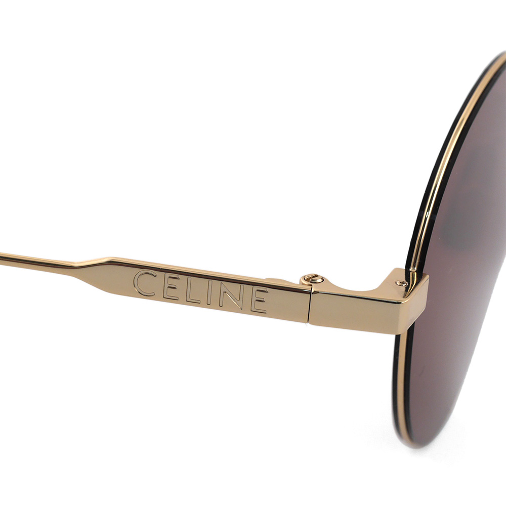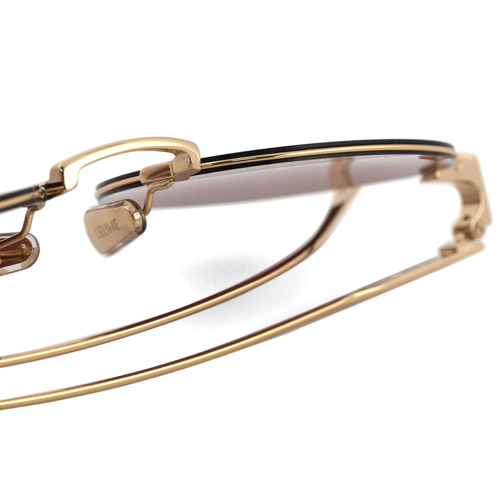 一見レンズ周りのリムが無いようにも見える超軽量のスタイリッシュなメタルサングラス。右テンプルに「CELINE」、左テンプルに「PARIS」のロゴが刻印された新しい仕様も特徴です。